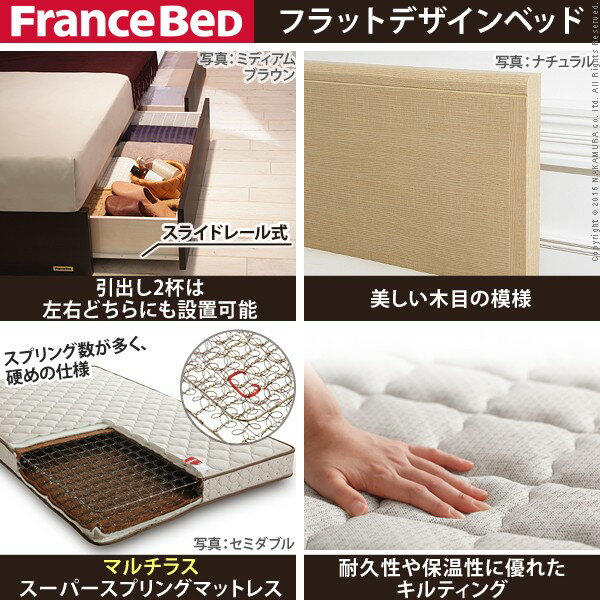 ●安心のメーカー2年保証 【セット構成】ベッドx1・マットレスx1 【カラーバリエーション】ダークブラウン・ミディアムブラウン・ナチュラル 【仕様】 ■ベッド 本体:プリント紙化粧合板 床板:布張り 引出:スライドレール ◎組立品 ■マットレス 張地:ポリエステル64%、綿27%、レーヨン9% 中身:ウレタンフォーム、パームパッド、ポリエステル綿、防虫不織布 コイル:マルチラススーパースプリング・コイル数1026 【サイズ】 ■ベッド 外寸:幅123x奥行200x高さ87cm/重量:約54kg 床面高さ:22.5cm 宮奥行:5cm 引出内寸:幅86.5x奥行37x高さ11cm(x2杯) ■マットレス 外寸:幅122x奥行195x高さ16cm/重量:約20kg 株式会社ナカムラ(I-4700227)