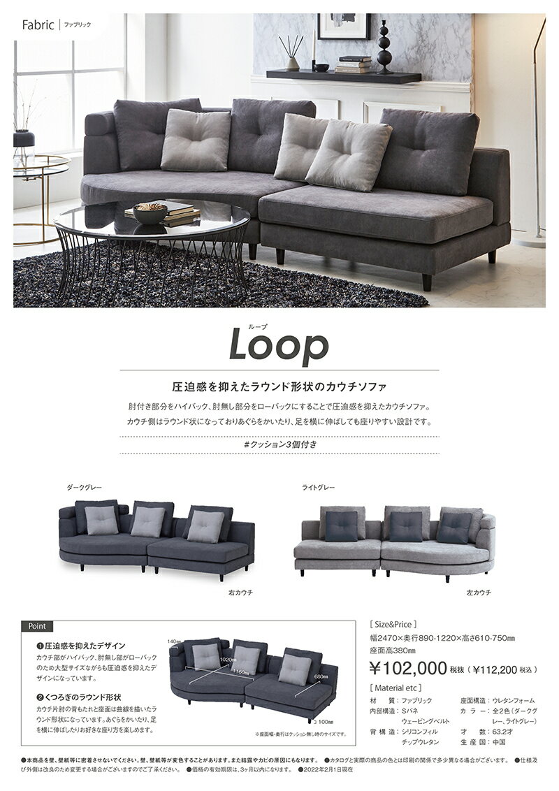 〔 カウチソファ ループ 〕圧迫感を抑えたラウンド形状のカウチソファ [商品詳細] ◆サイズ 幅247×奥行89-122×高さ61-75cm(座面高38cm) ◆張地 ファブリック ◆内部構造 Sバネ ウェービングベルト ◆背構造 シリコンフィル チップウレタン ◆座面構造 ウレタンフォーム ◆生産国 中国 ◆ご注意 ※イメージ違い等によるご交換・ご返品はできませんので予めご了承下さい。