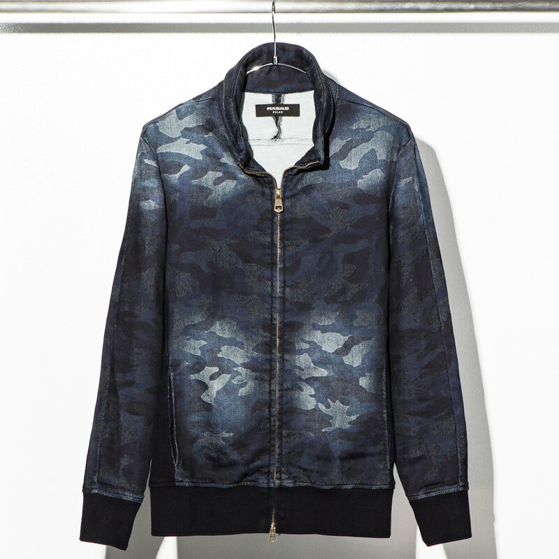 デニムのような見た目からは想像がつかない動きやすさが人気のジョグ素材で仕上げたカモフラージュ柄トラックジャケット。